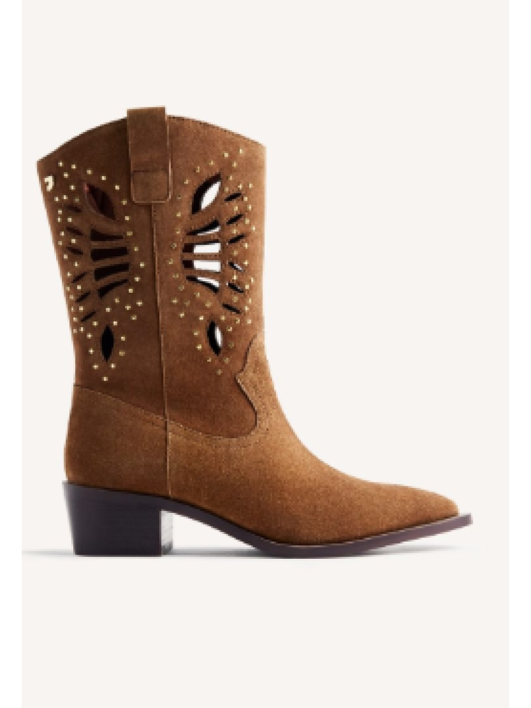 Botas de piel serraje estilo cowboy con calado y tachas en acabado dorado. Caña media, punta ovalada y tacón cubano. Cuentan con plantilla acolchada y cremallera en el lateral interno de la caña. Altura tacón: 4 cm. Altura caña: 21 cm. Seguimos la guía estándar de anchos de caña, ajustando la medida según la talla. El número 37 se adapta a gemelos con un perímetro de hasta 38 cm.