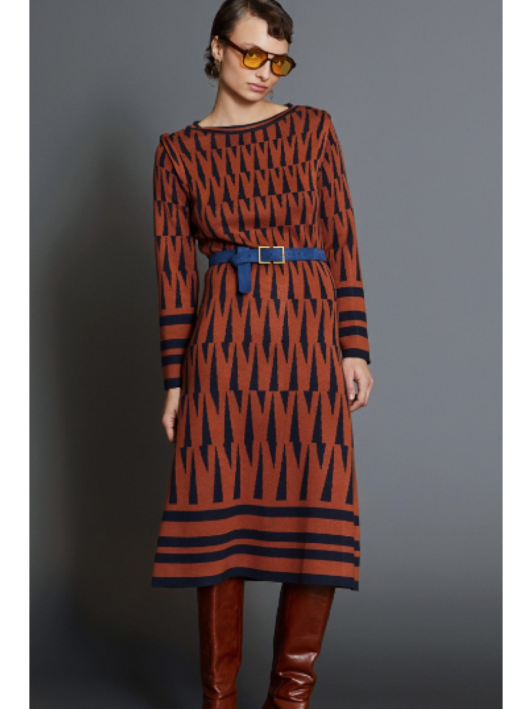 Vestido punto geométrico marrón con detalles en marino.