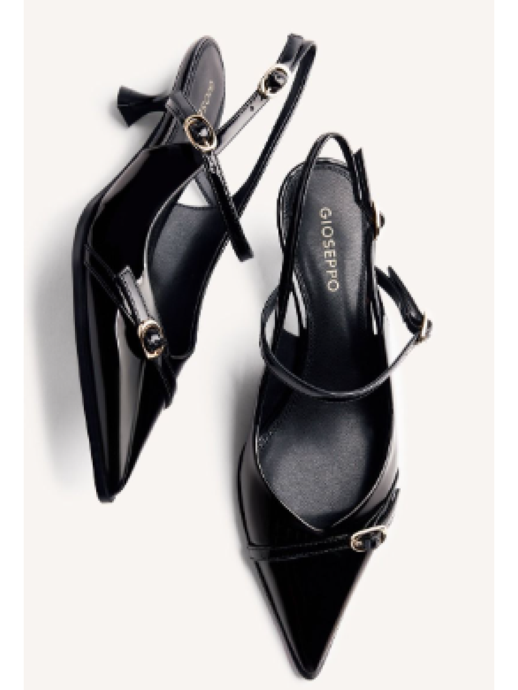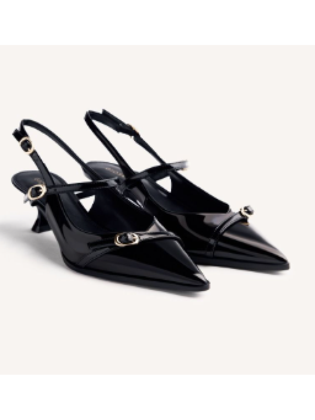 Zapatos de tacón tipo salones destalonados con acabado en efecto charol y detalle de hebillas. Punta afilada. Cuentan con tacón bajo tipo carrete, cierres ajustables y planta acolchada. Altura tacón: 4 cm.Composición:
